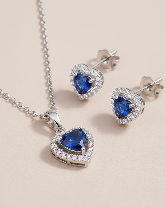 Set Plata 925 Corazon con circón Zafiro micro circones Blancos - Collar y Aros