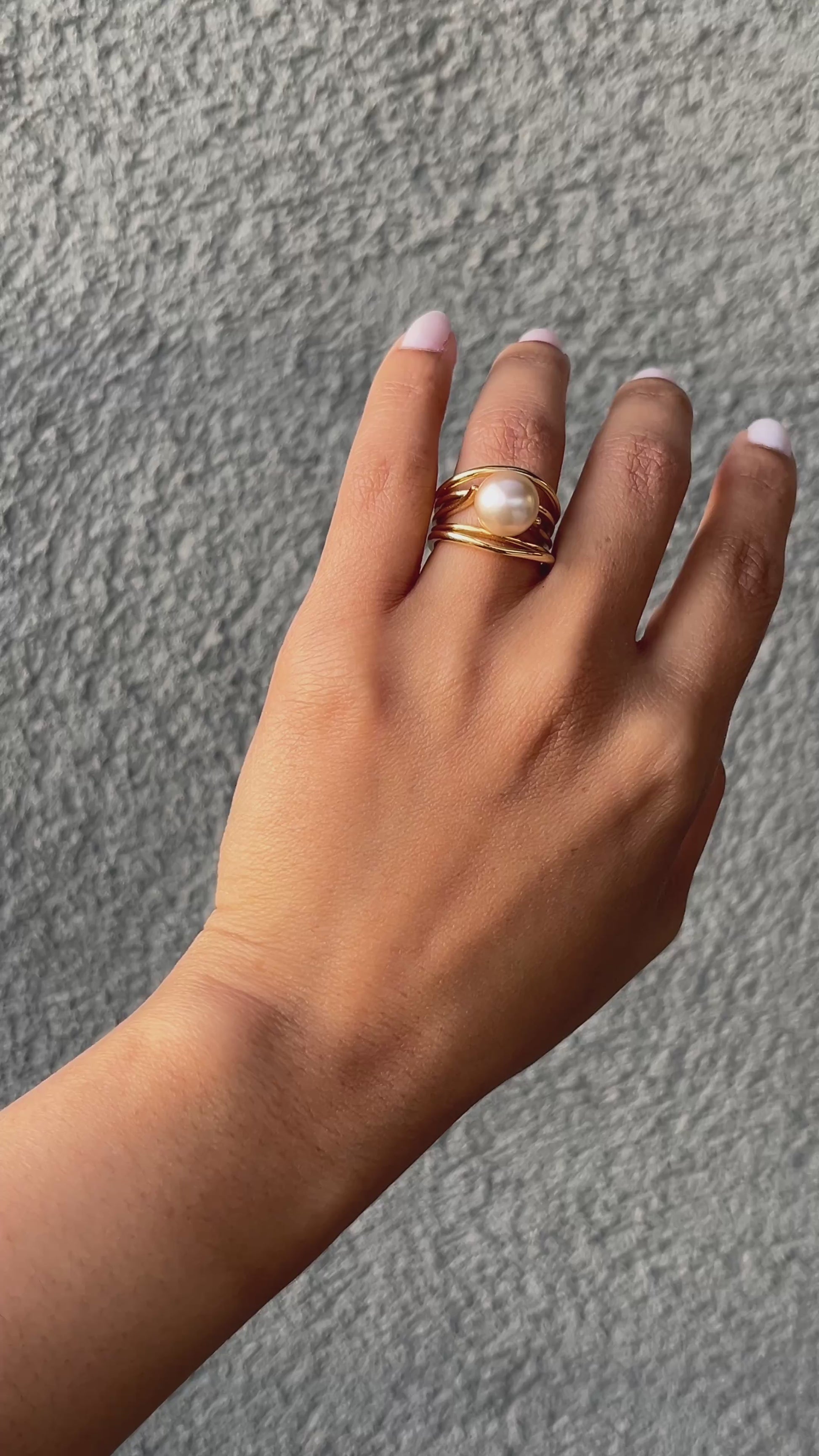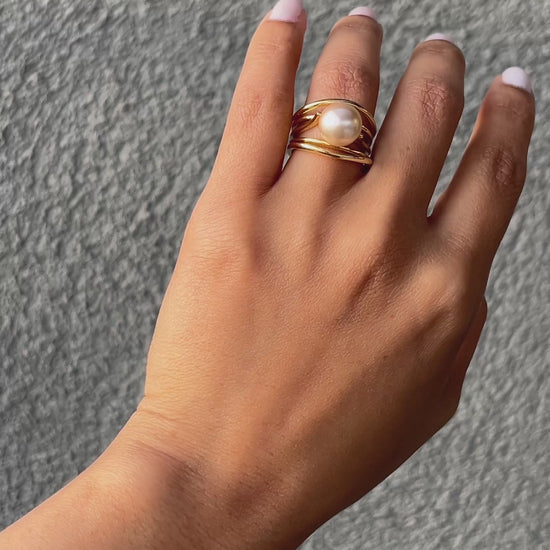 Su estructura dorada, compuesta por delicadas líneas entrelazadas, aporta un toque moderno y elegante que realza la belleza de la perla central.