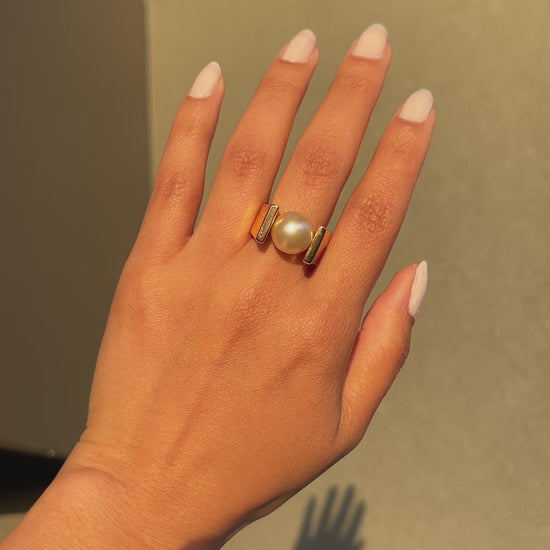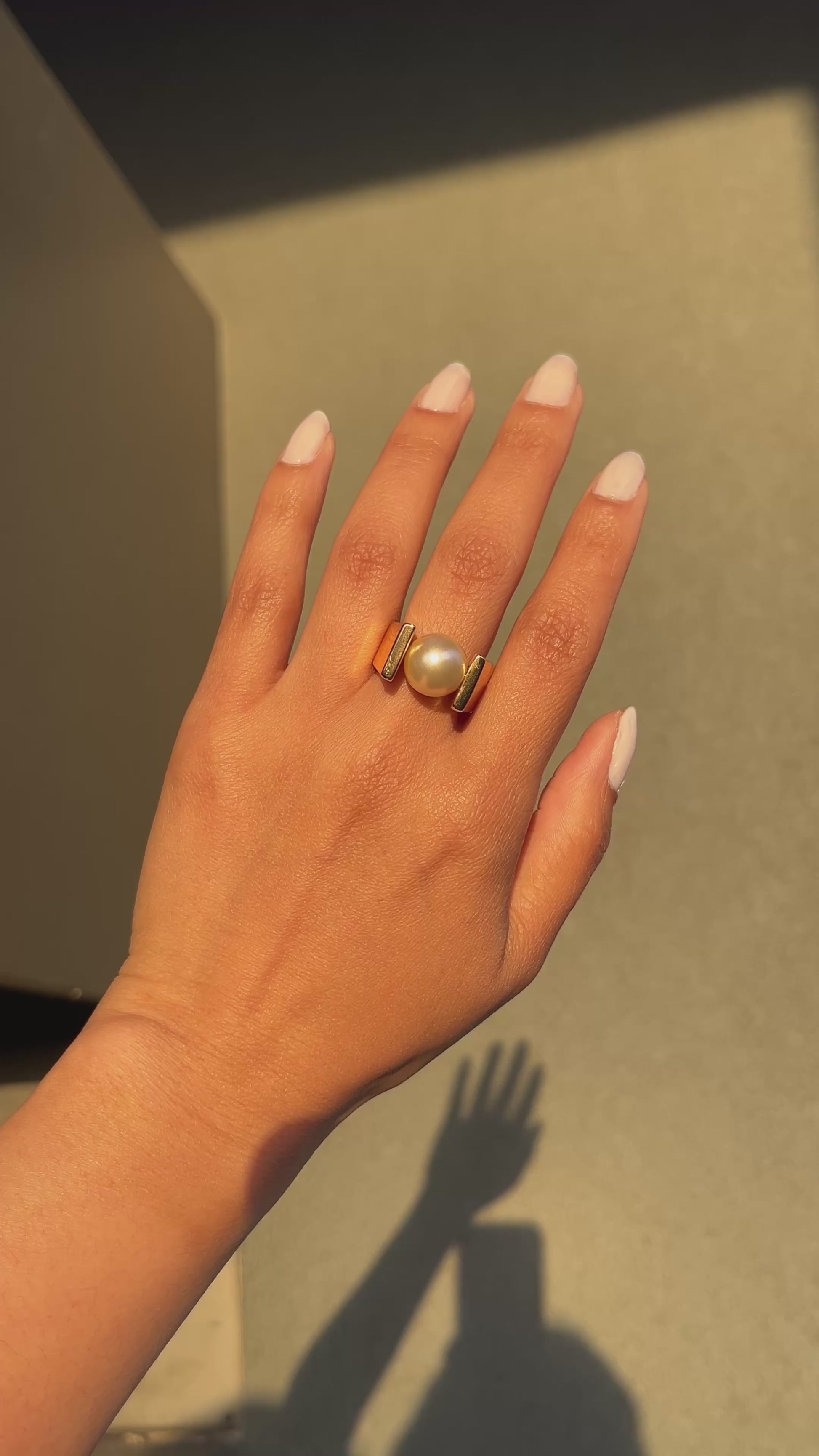 Este anillo presenta una perla de 12 mm color nácar (combinación de blanco con dorado), reconocida por su brillo natural y su acabado impecable, fabricada artesanalmente en España (No natural).