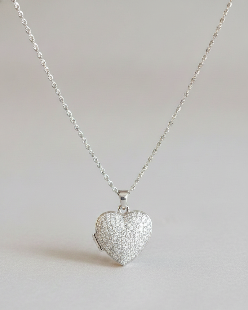 Este relicario en forma de corazón es una pieza que combina elegancia, brillo y un profundo valor sentimental. Elaborado en plata 925 y decorado con finos microcircones, es el accesorio ideal para quienes aman llevar consigo sus recuerdos más importantes.