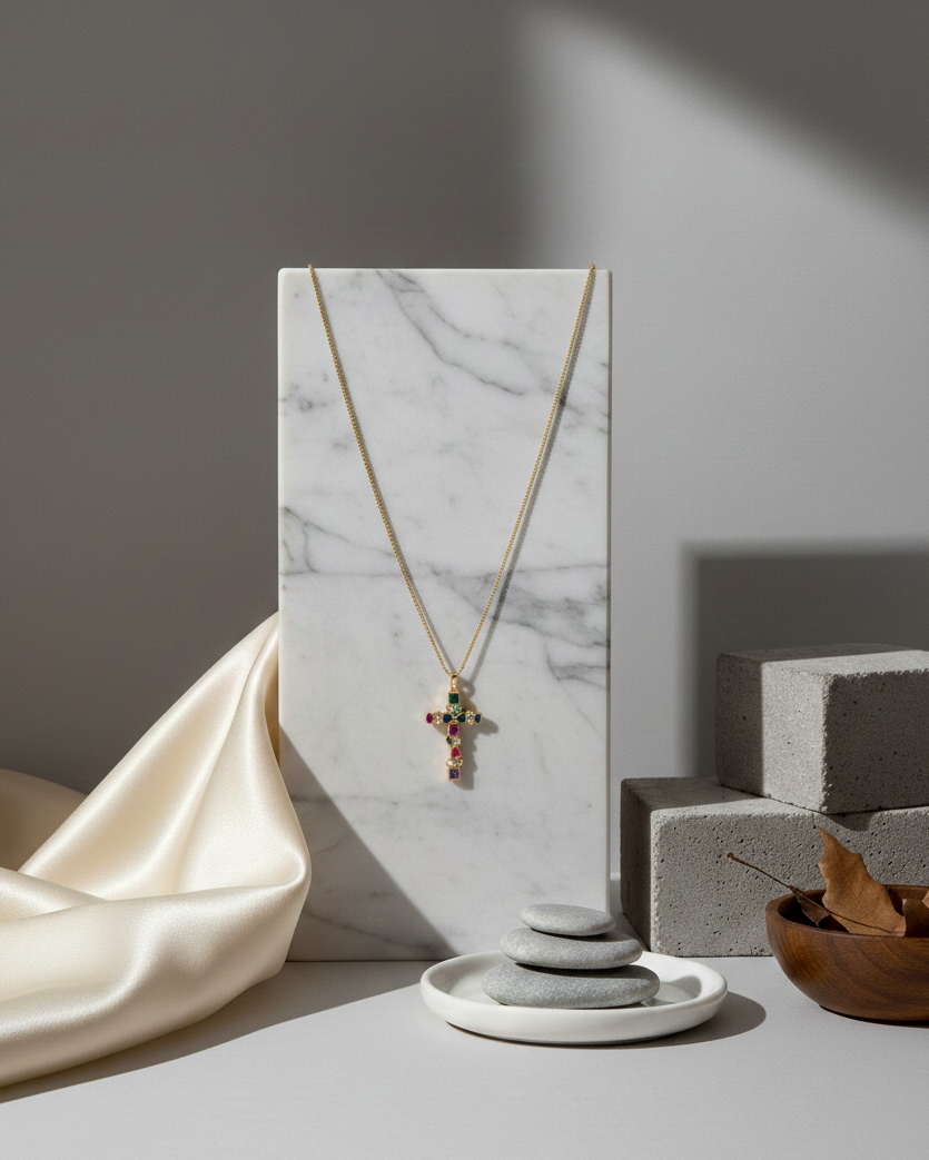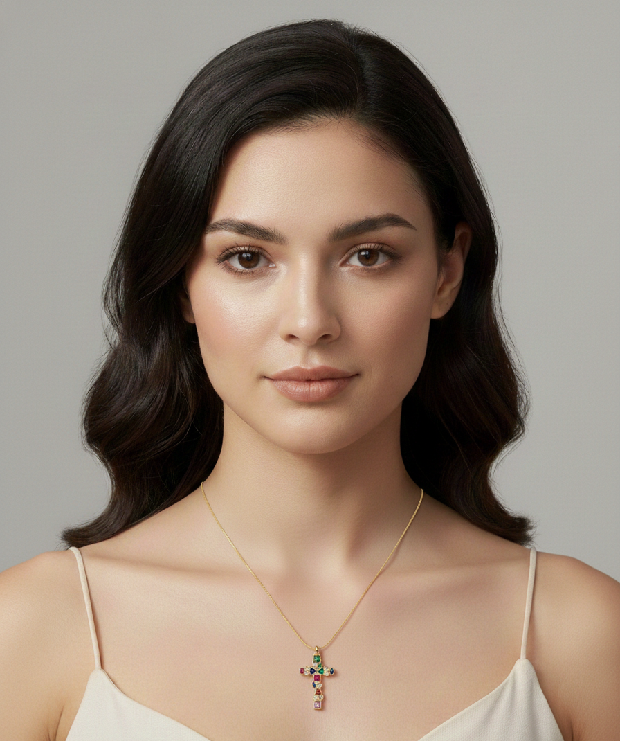 Collar bañado en oro de 18K con colgante de cruz engastado con circones de colores, símbolo de fe, protección y equilibrio interior. La cruz representa fortaleza, guía y conexión espiritual, recordándonos la luz que acompaña cada camino.