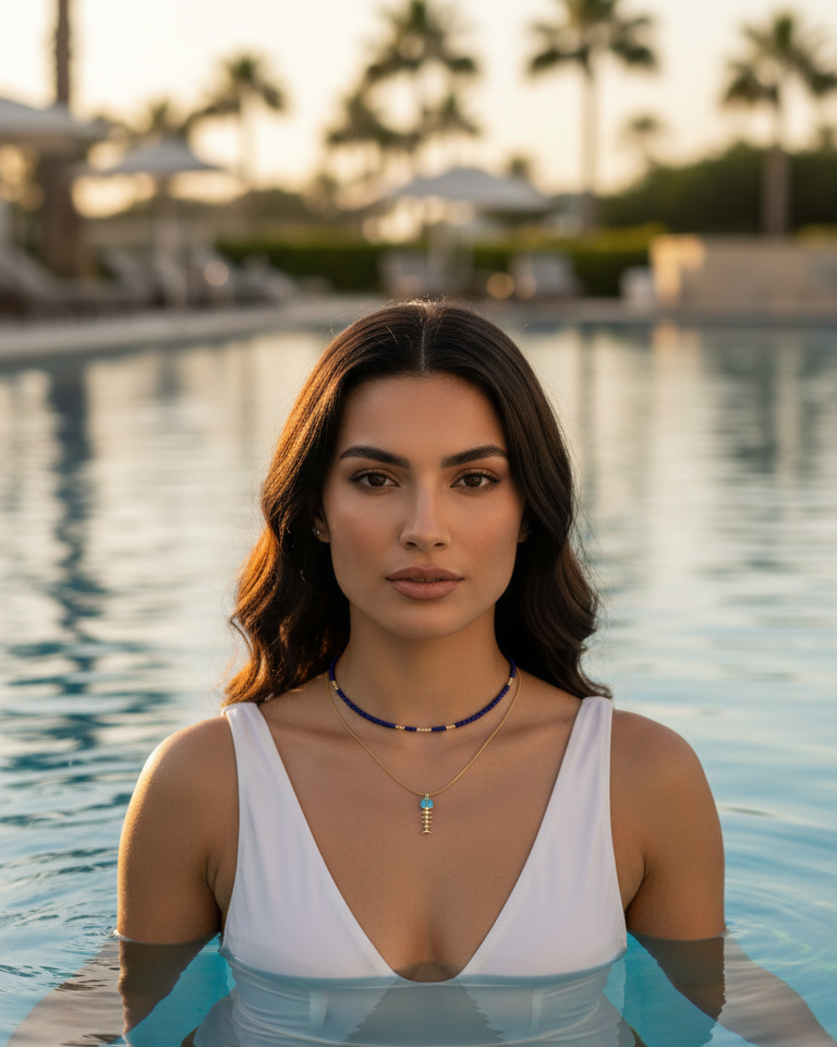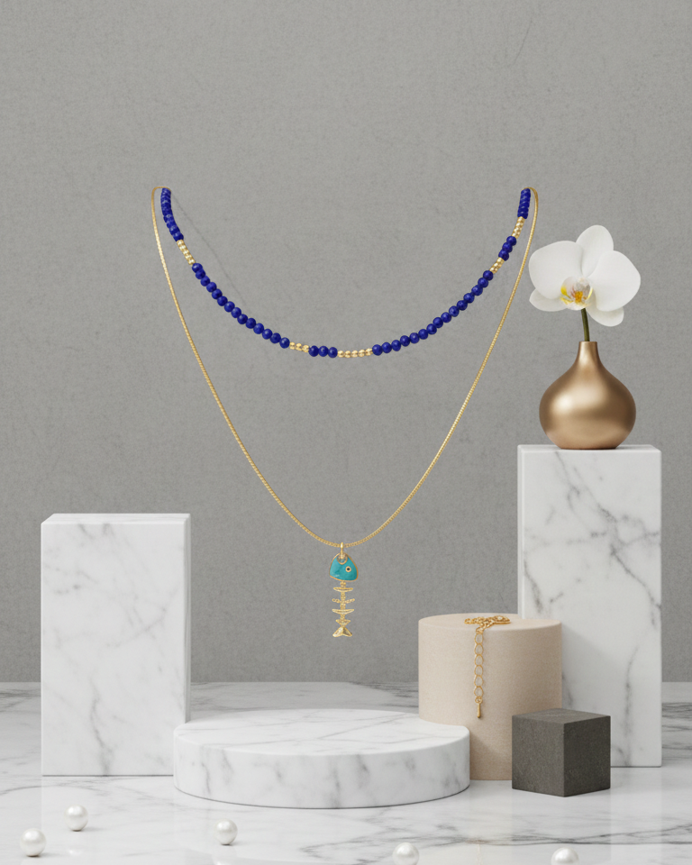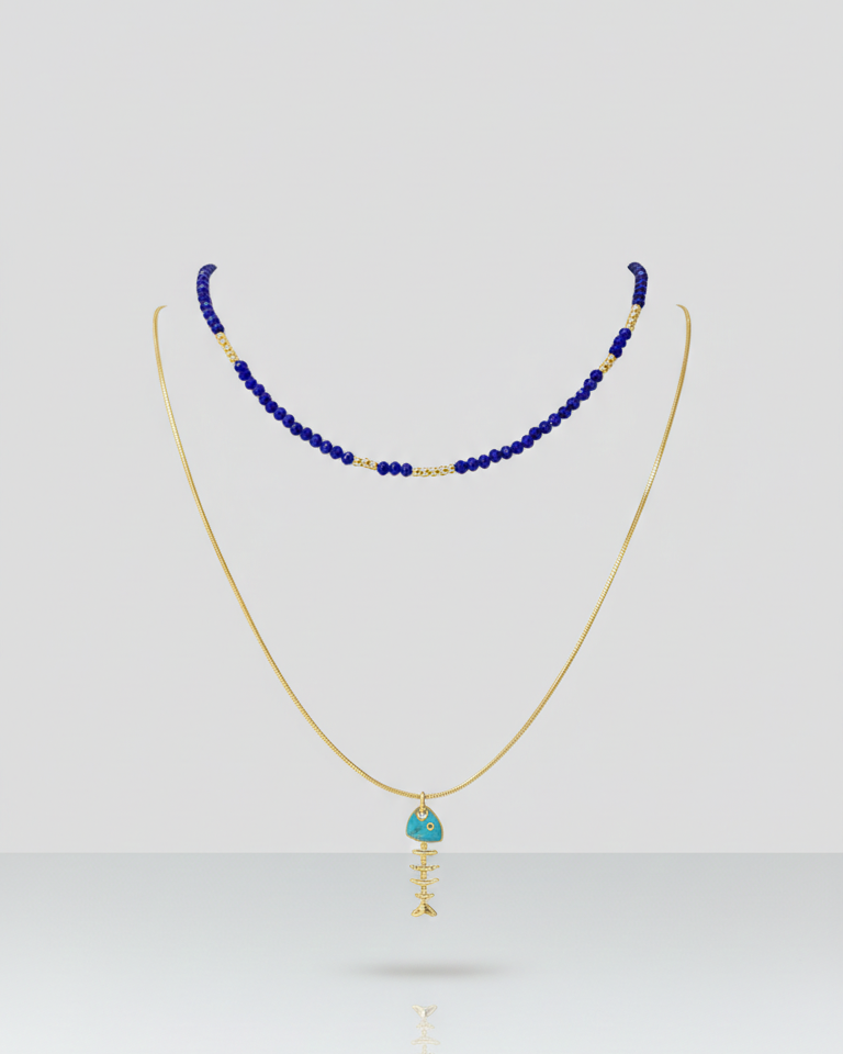 Set de collares pensado para crear un layering equilibrado entre color, luz y energía. El primer collar es una pieza artesanal de Mare Rosato, elaborada con cristales color zafiro y delicadas bolitas doradas bañadas en oro de 18K, evocando calma, intuición y sofisticación. Y se complementa con un collar con colgante de pescado esqueleto que simboliza transformación, fluidez y la conexión profunda con el mar y los ciclos de la vida.